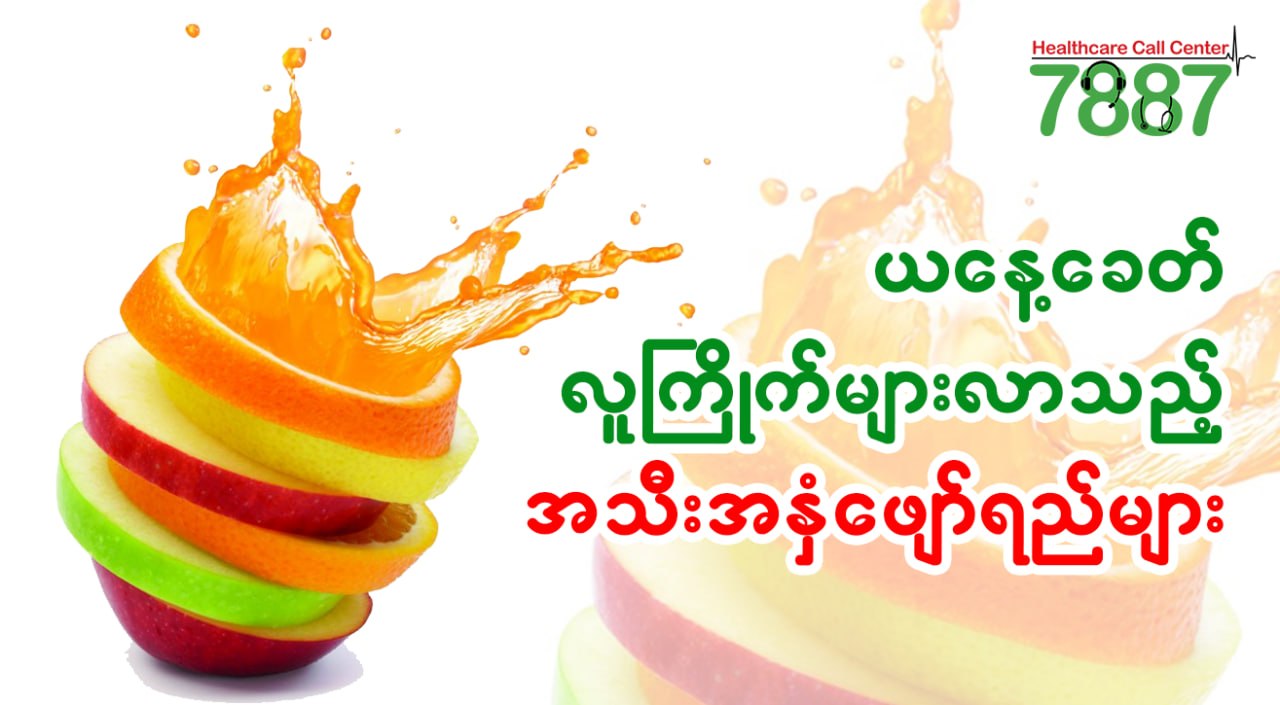 "ရေဆာလျှင် ရေကိုသာသောက်ပါ။ ရေကိုတစ်နေ့လျှင် နှစ်လီတာမှသုံးလီတာ အနည်းဆုံးသောက်ပါ။ အရောင်ပါသောအချိုရည်များ soft drink များမသောက်ရပါ။ သဘာဝအသီးအနှံမှရသ...